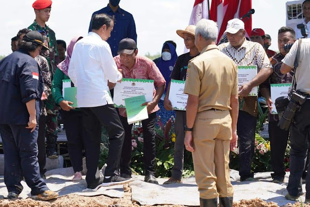 Blora - Presiden Republik Indonesia, Joko Widodo menyerahkan Surat Keputusan (SK) Perhutanan Sosial Kawasan Hutan Dengan Pengelolaan Khusus (KHDPK) di areal perhutanan sosial Desa Gabusan, Kecamatan Jati, Kabupaten Blora, Jawa Tengah (10/3/2023).